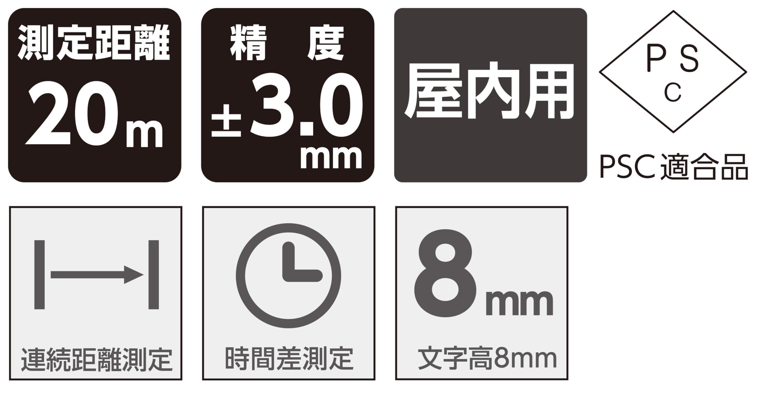 ●直感操作で使えるワンボタン・コンパクト距離計です。 ●明るい場所でも読み取りやすい大型黒液晶を採用しました。 ●測定ボタンを押す際の手ブレを軽減するセルフタイマー機能付です。 ●連続して距離を測れる連続距離測定機能付です。 ●PSC認証適合製品です。