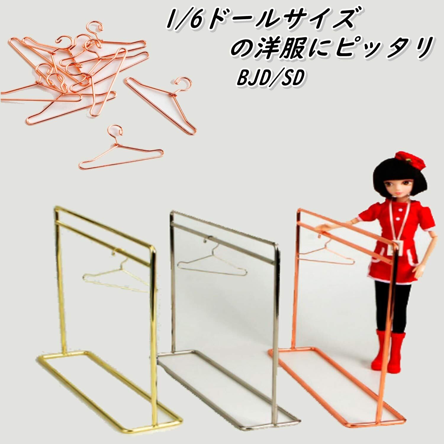 1/6サイズの着せ替え人形用洋服ミニハンガー10個と、ハンガーラックのセットです。