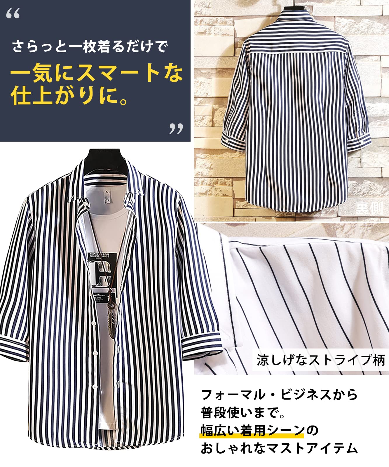 [エアバイ] 5色展開 七分袖 ストライプ 半袖 シャツ メンズ S〜2XL