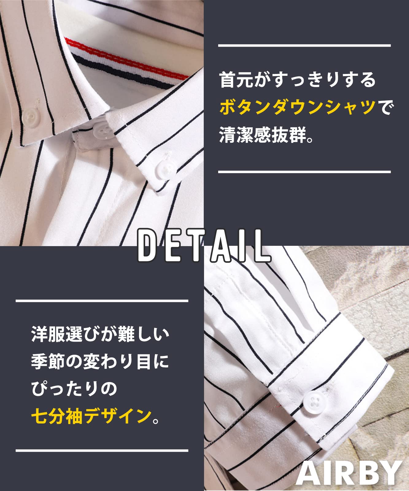フォーマル・ビジネスシーンから普段使いまで。 着用シーンも幅広く、1枚は持っておきたいオシャレなマストアイテムです。 鮮やかなストライプでクールにキマる。 シンプルながらもコーデのアクセントになるので、一気にお洒落な印象になります。 ボタンダウンシャツは首元がすっきりするので、清潔感のあるスタイリッシュコーデが叶います。 トップスや羽織物としてはもちろん、インナーとしての相性も良いので幅広いスタイルをお楽しみいただけます。 キレイなシルエットでスタイル良く魅せてくれます。 サラッと1枚着るだけで一気にスマートに仕上がります。 軽やかな風合いの七分袖と、オールマイティーに使いやすい長袖の2種類からお選びいただけます。 肌触りの良いやわらかな素材感で1日中快適な着心地。 長時間の着用でも疲れ知らずで、ストレスフリーにお過ごしいただけます。