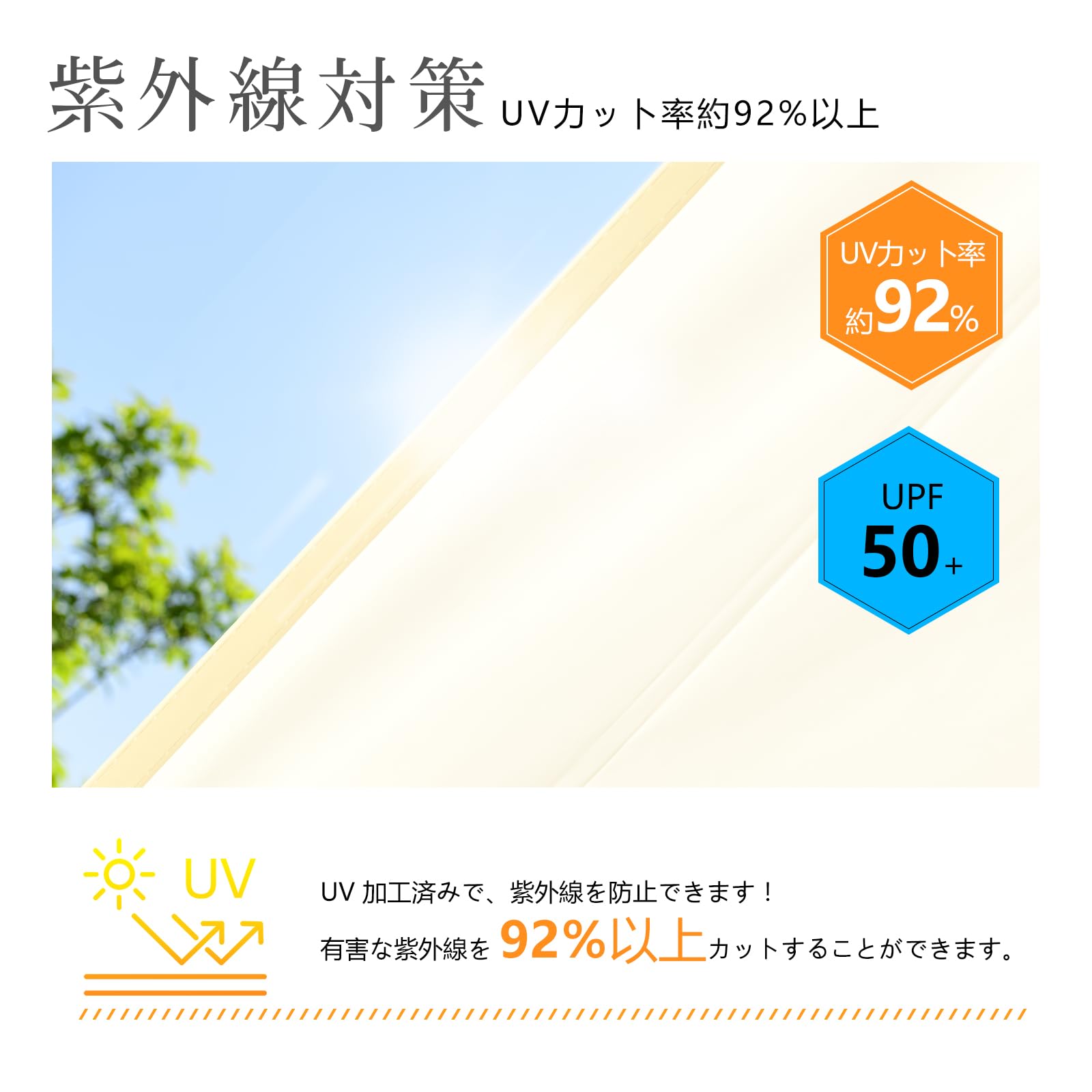 UV加工済みで紫外線を防止!有害な紫外線も95%カットするので、子供たちが遊ぶお庭や砂場の日よけに最適で。