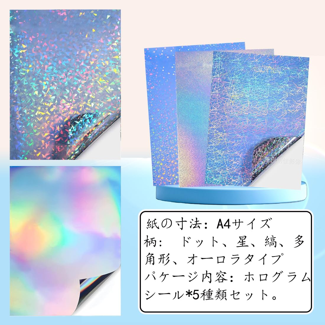 紙の寸法:A4サイズ、柄: ドット、星、縞、多角形、オーロラタイプ;適用可能なプリンタタイプ:インクジェット, レーザープリンター兼用;パケージ内容:ホログラムシール*5種類セット。自己粘着タイプ、使いやすい。A4サイズで、さまざまなニーズに対応できます、使用に便利です。