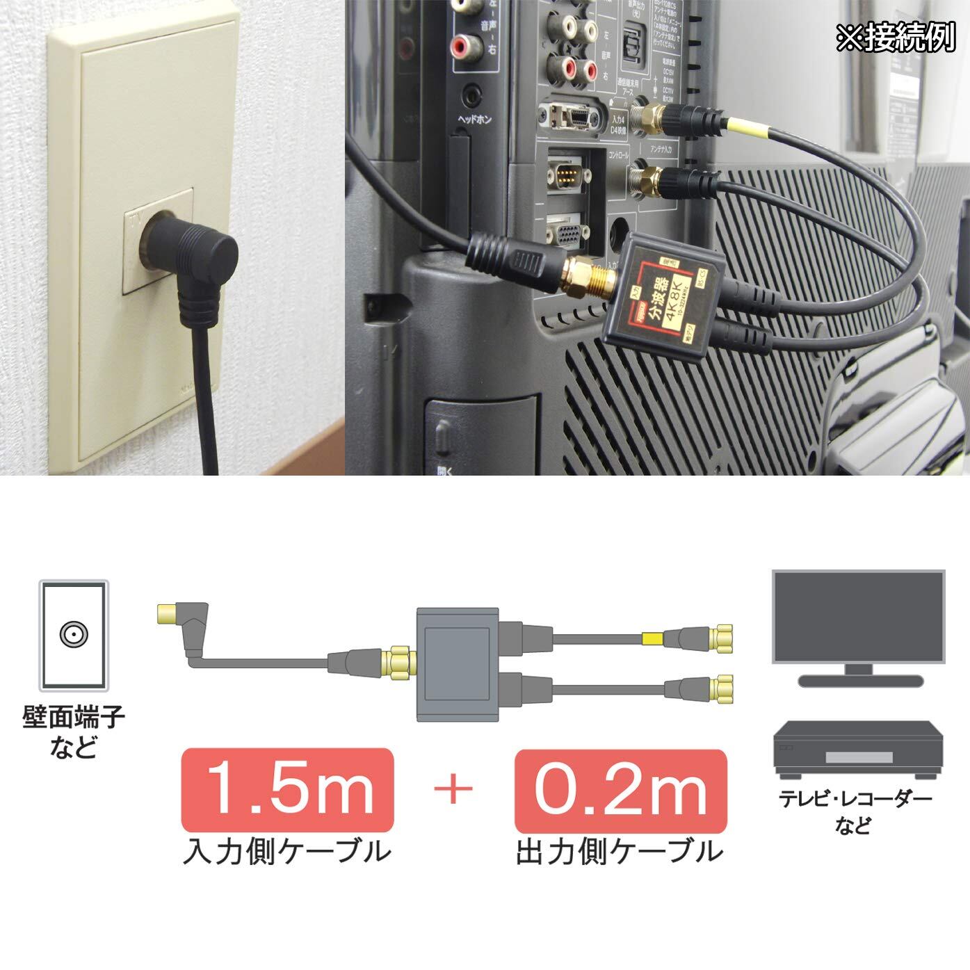 分波器ケーブル長:20cm、入力端子:F型ジャック、出力端子:F型接栓プラグ、付属ケーブル長:1.5m、F型プラグ(L型)-F型コネクタ(接栓ネジタイプ)、カラー:ブラック、プラグ部分:金メッキ