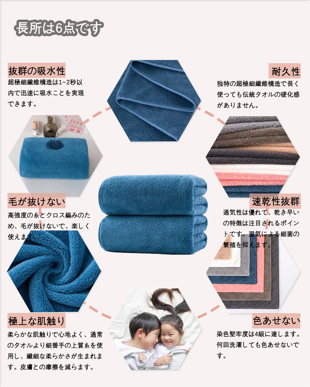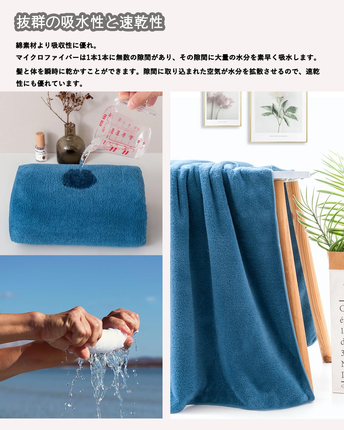 【抜群の吸水性と速乾性】綿の素材より吸水性が優れます。マイクロファイバー素材の表面は数えられない隙間があり、その隙間に大量の水分を素早い吸水できます。髪や肌にそっと当てるだけで水分が吸収される素材であり、また汚れも落としやすい特徴があります。隙間に取り込まれた空気が水分を拡散させるので、速乾性のポイントで、バスタオルの雑菌を抑え、健康を保つことができます。