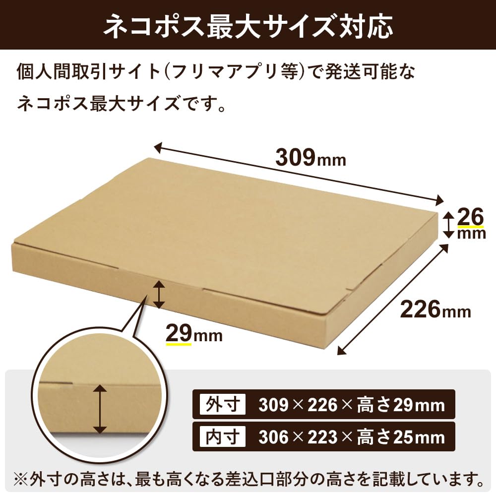 ネコポス最大サイズ高さ3cm(個人間取引サイト)に対応!簡易組み立てダンボール箱です。ご利用の際は膨らみ等によるサイズオーバーに注意ください。