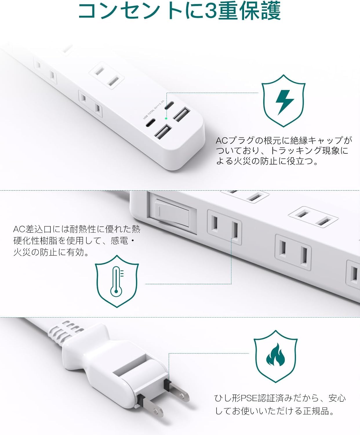 【雷サージ保護機能&コンセント4重保護】雷サージ保護機能より、サージ、電圧スパイク、電圧ノイズ、静電気による干渉を排除し、電気製品の耐用年数を効果的に延長します。電気火災を防ぐため、ACプラグの根元に電気を通さない絶縁キャップがついており、トラッキング現象による火災の防止に役立ちます。さらに、AC差込口には、万一の発熱の際にも融解しにくく、電気火災の防止に有効な耐熱性に優れた熱硬化性樹脂を使用しています。電源コードには、二重被ふくコードを採用していますので、断線や被ふく破れによる感電・火災の防止に有効です。