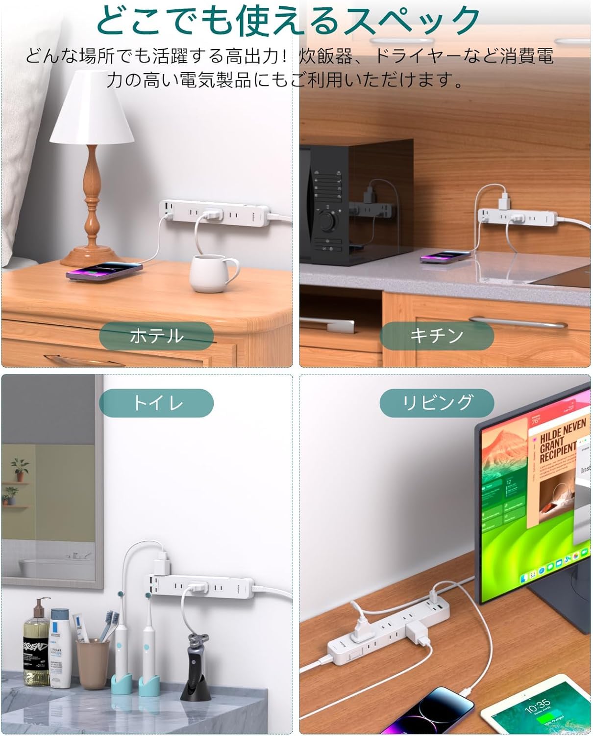 【10-in-1電源タップ&2Type-Cポート】電源タップ は新販売の携帯電話に対応するために2個typeCポートも特別に追加されており、typeCポートの充電ヘッドを購入する費用を節約できます。USBポート付だからアダプタ不要で、省スペースでスッキリにします。出張、会議室、自宅などで12台デバイスを充電できます。本製品は日本の電圧(100~125V)に合わせて設計されるので、日本国内、中国、米国または東南アジアでも使えます。
