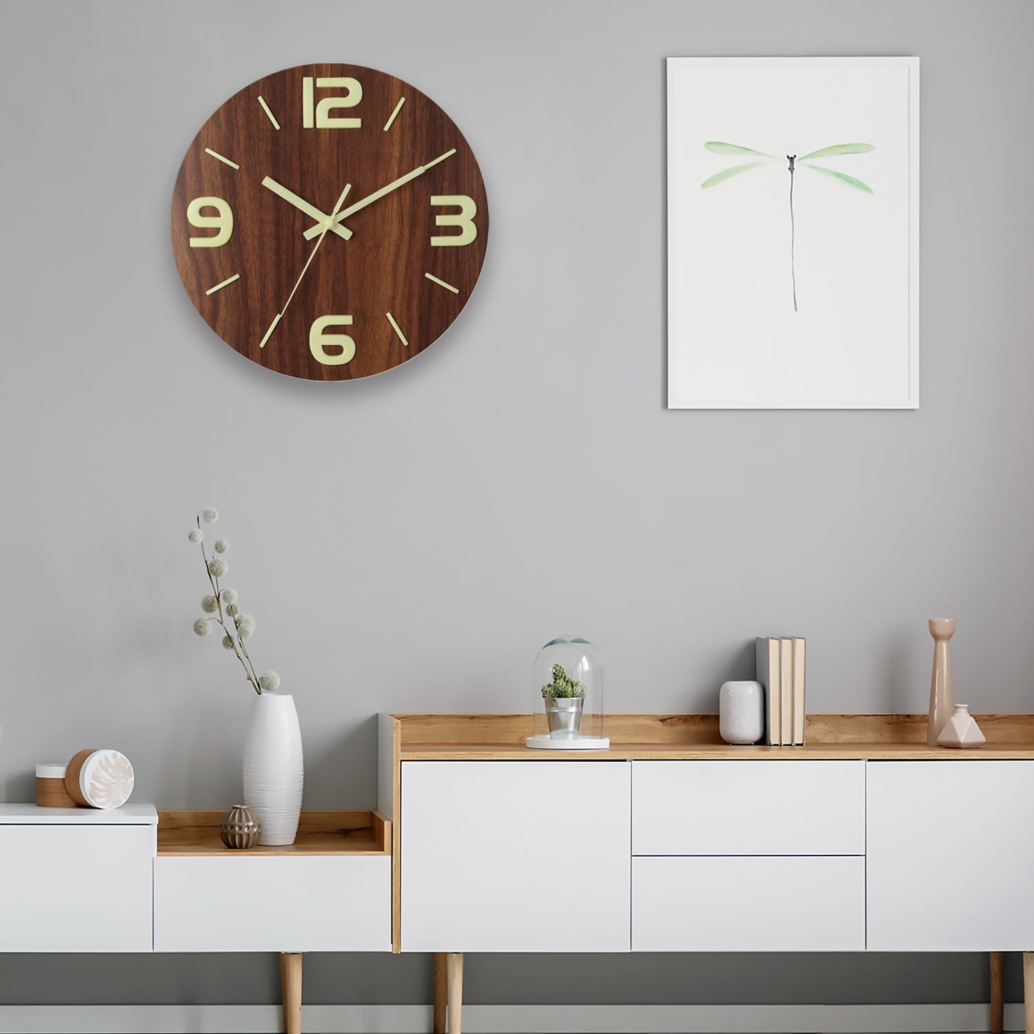 【夜光掛け時計】大きくてクリアな3Dアラビア数字で、お部屋の隅から見やすいです。時計盤面のインデックスと指針には蛍光塗料を印刷していたので、蓄光後、暗い所で発光できて、夜時間も確認できます。(ご注意:光る前に、蓄光しなければなりません。)