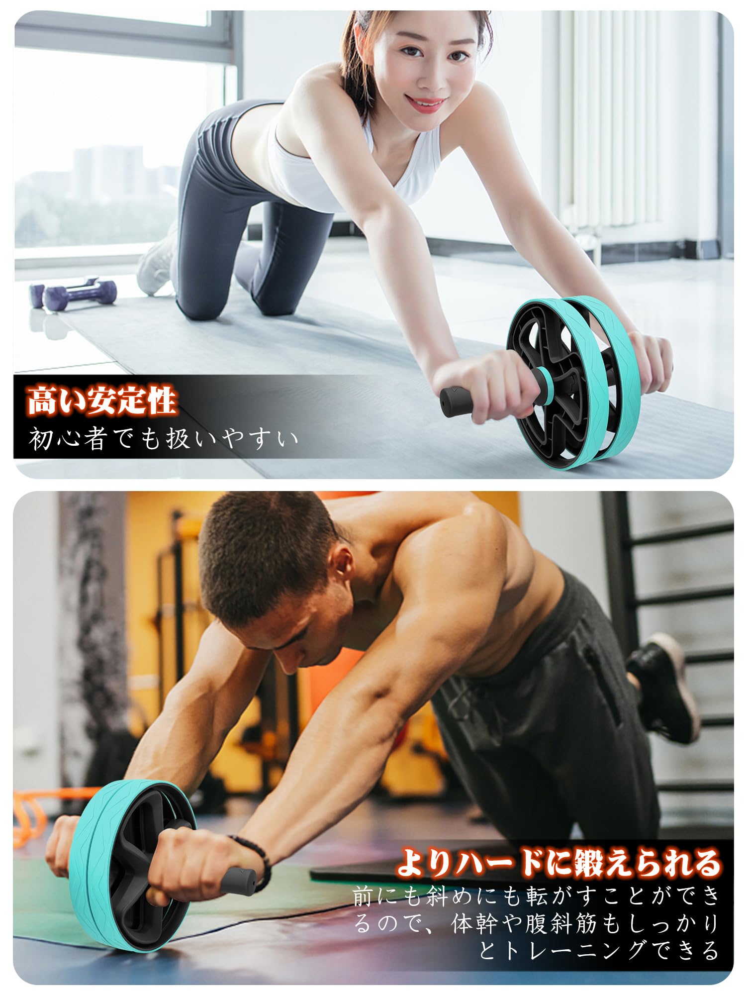 【高負荷】ホイールの組み合わせによって、斜めにも進めるので、体幹や腹斜筋もしっかりとトレーニングできる。