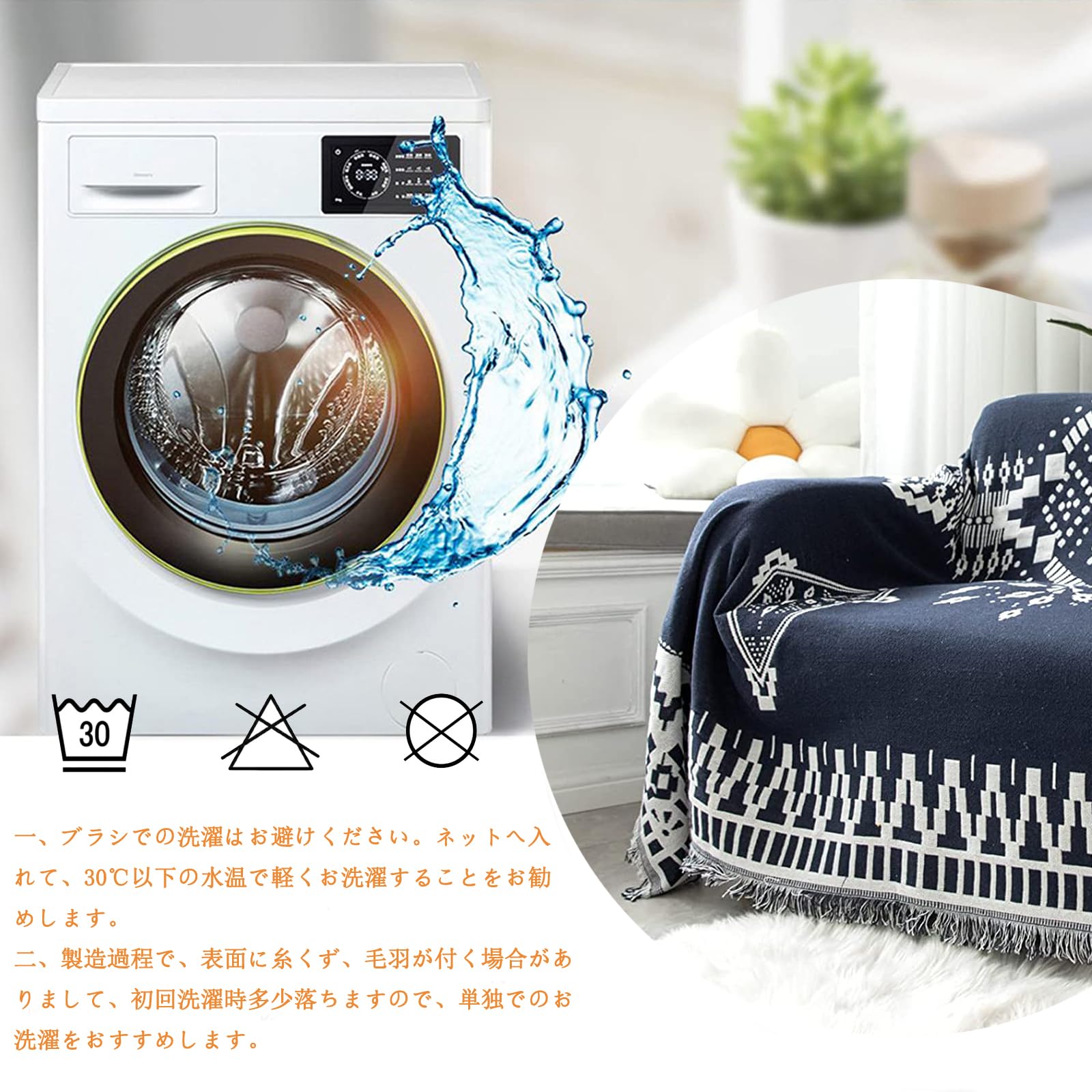 水洗える:洗濯の際は、単独でお洗濯をおすすめします、ブラシでの洗濯はお避けください。ネット へ入れて、30℃以下の水温で軽くお洗濯する ことをお勧めします。製造過程で、表面に糸くず、毛羽が付く 場合がありまして、初回洗濯時多少落ちます ので、単独でのお洗濯をおすすめします。