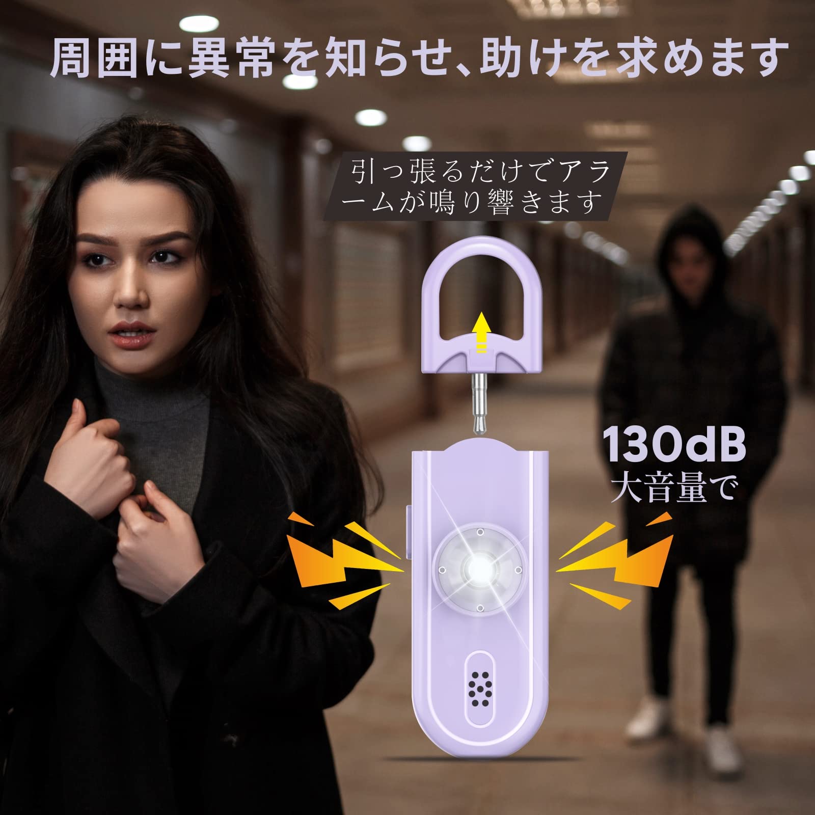 【130DB大音量】小さくても測定距離0.5mで130dBを記録した大音量防犯アラームです。小型・薄型な見た目とは裏腹に、ピンを外すと飛行機の離陸音と同じレベルの大音量で犯人を撃退。危険に遭遇しても300メードル先にいる人の注意を引き付けます。(*本製品は事故やトラブルの緊急時に鳴らして相手を威嚇するために使用するものです。それ以外の用途には使用しないでください。)