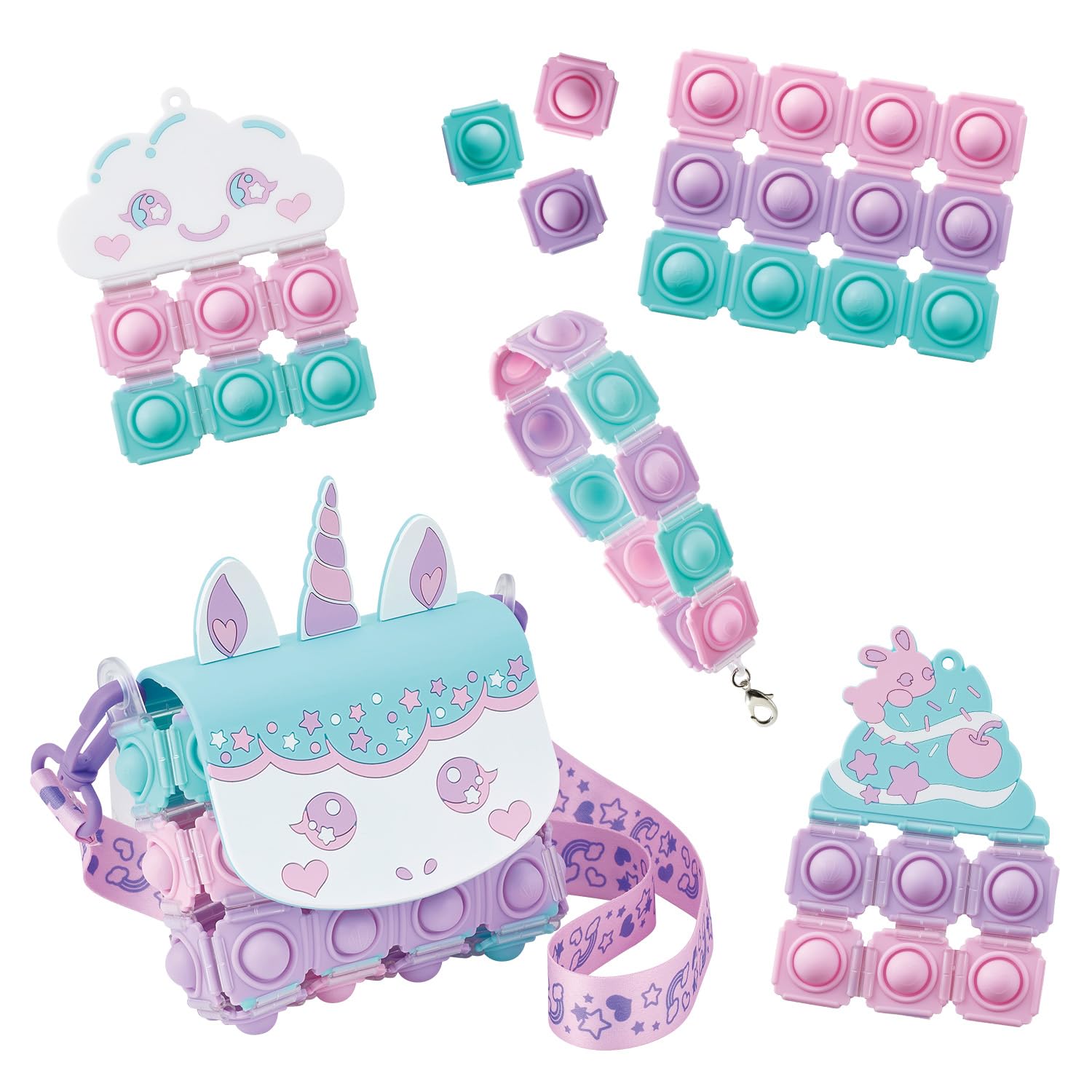 「スイートユニコーンバッグセット」では ・ユニコーンバッグ ・アイスクリームプッシュポップ ・ストラップ ・雲プッシュポップ の4アイテムを作ることができます!