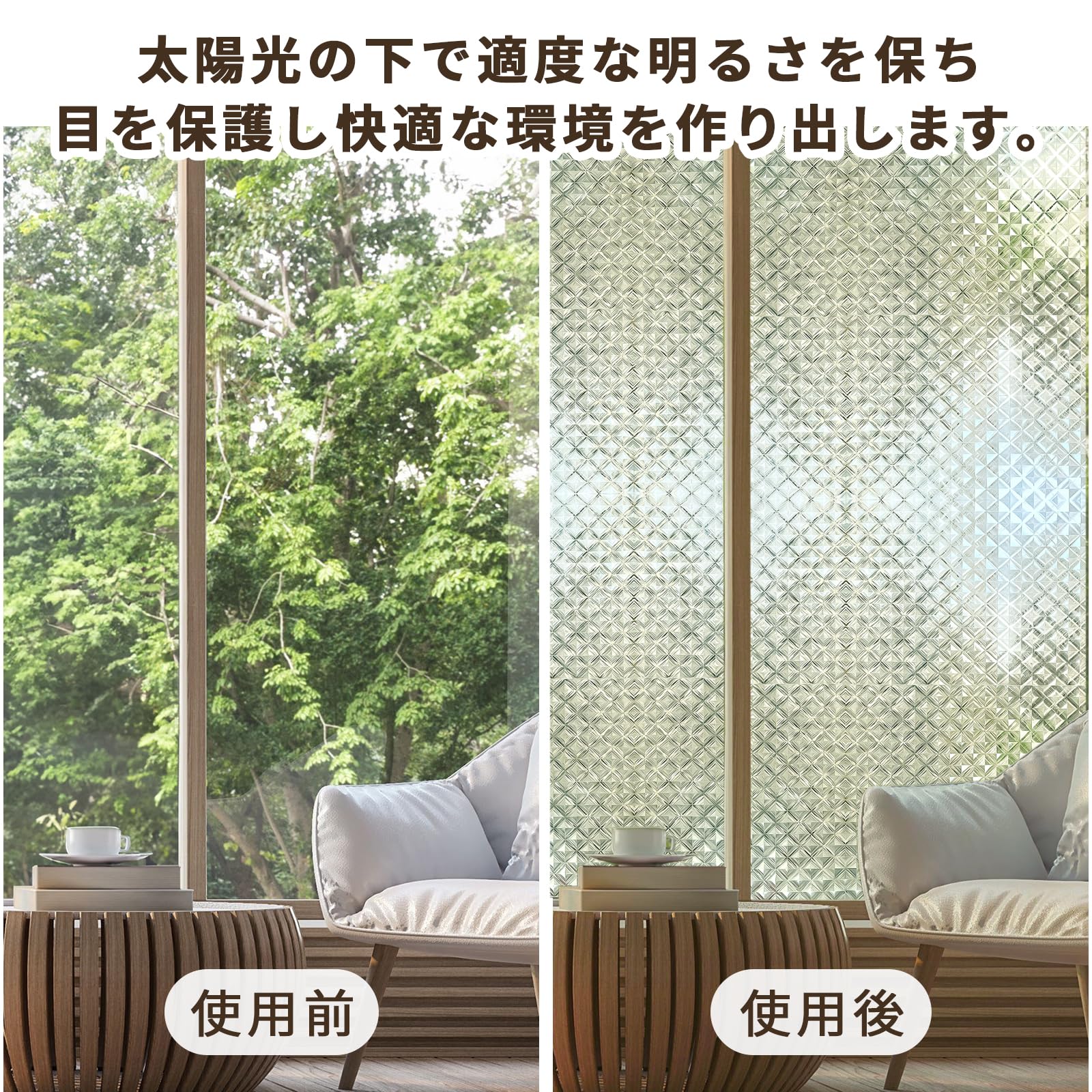 【目隠し、プライバシー保護】フィルムは元々透明なものですが、ガラスに貼れば光を屈折して半透明になって、虹色の艶を放します。光や使用環境によって、色や目隠し効果は少々異なります。光りが当たるとキラキラと虹色に輝きます。天然の日光が差し込む朝・昼も綺麗ですが、人工的なライトが映る夜も綺麗です。部屋のおしゃれな演出と目隠しの両立できます。外から室内が見えづらく、遠い目のプライバシーを保護します。外からの視線を遮りながら、かつ、充分に外の光を室内に取り込めます。カーテンを閉めているときの閉塞感や窮屈感あるの暗い部屋から解放されるでしょう。※目隠しレベル: フィルムの格子の模様部分から薄っすら透けて見えるので、お風呂のガラスのような場所に使用することは、お勧めいたしません。